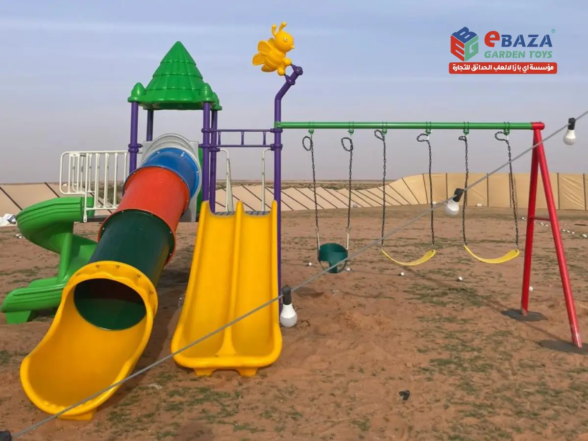 The swing frame is constructed using heavy-duty powder-coated steel with secure chain suspensions. Multiple swing seats allow children of different age groups to participate safely.