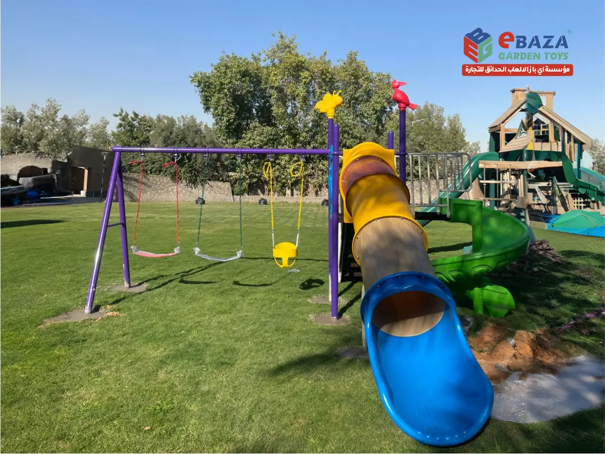 This private villa playground Dammam installation features a multi-functional play system combining slides and swings.